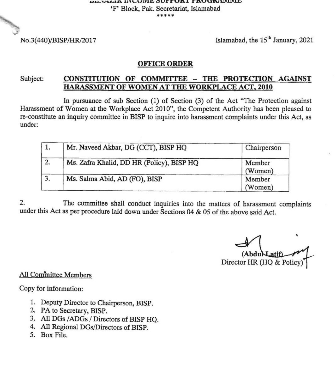The information about Benazir Taleemi Wazaif provided here has been collected from multiple online sources. For accurate and updated details, please visit your nearest BISP Tehsil Office or verify through the official 8171 portal. Constitution of Committee – The Protection Against Harassment of Women at Workplace Act- 2010